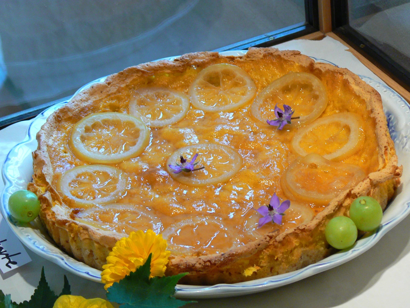 5. Rens og skyl citronerne. Skær dem i tynde skiver. Varm sukker, 2 dl vand og citronskiver, i en kaserolle under omrøring, indtil skallen er mør og den hvide hinde er gennemsigtig. Tag citronskiverne forsigtigt op og arranger på tærten. Hæld en tilpas mængde af den indkogte lage over tærten. Serveres lun eller kold med fløddskum.