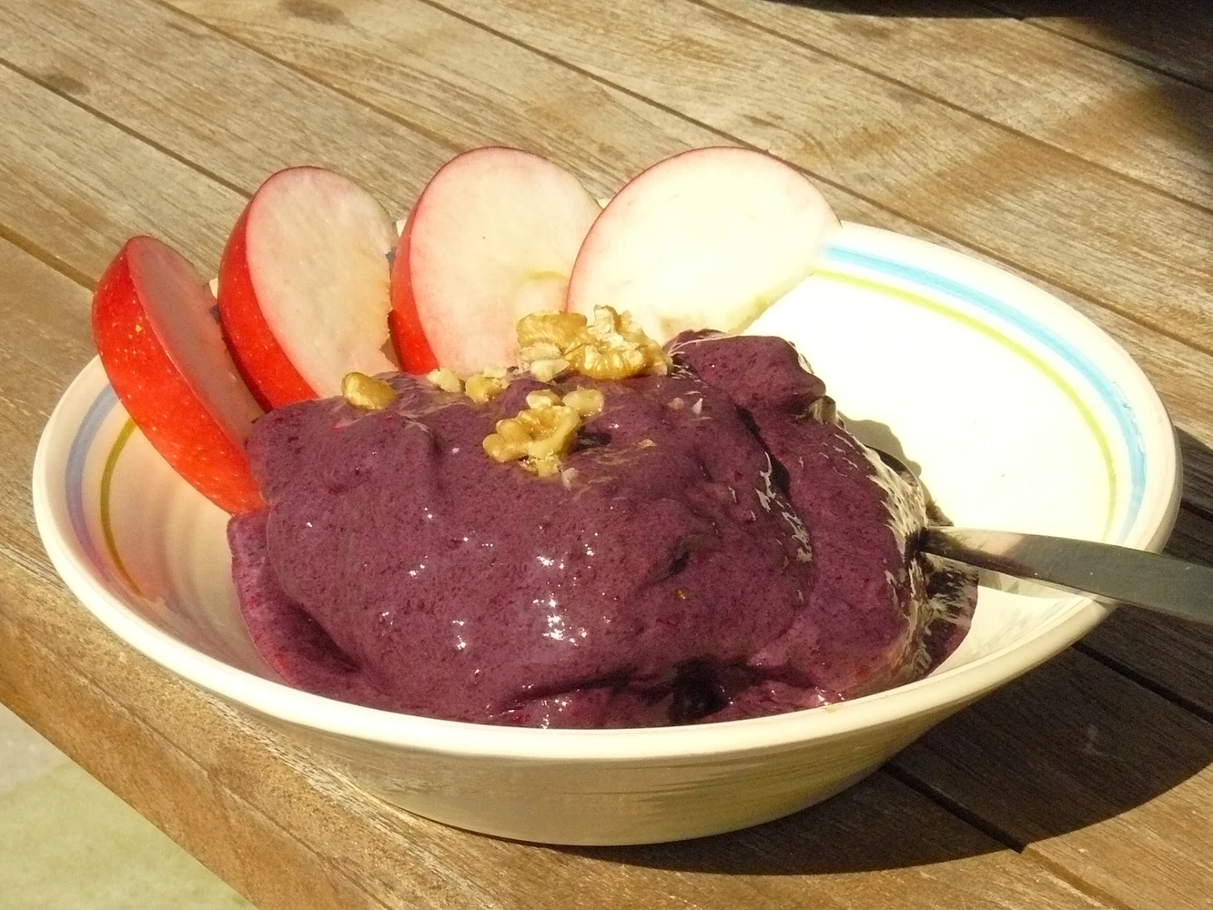Frosne solbær, æblebåde og lidt fløde - blendes i foodprocessor.