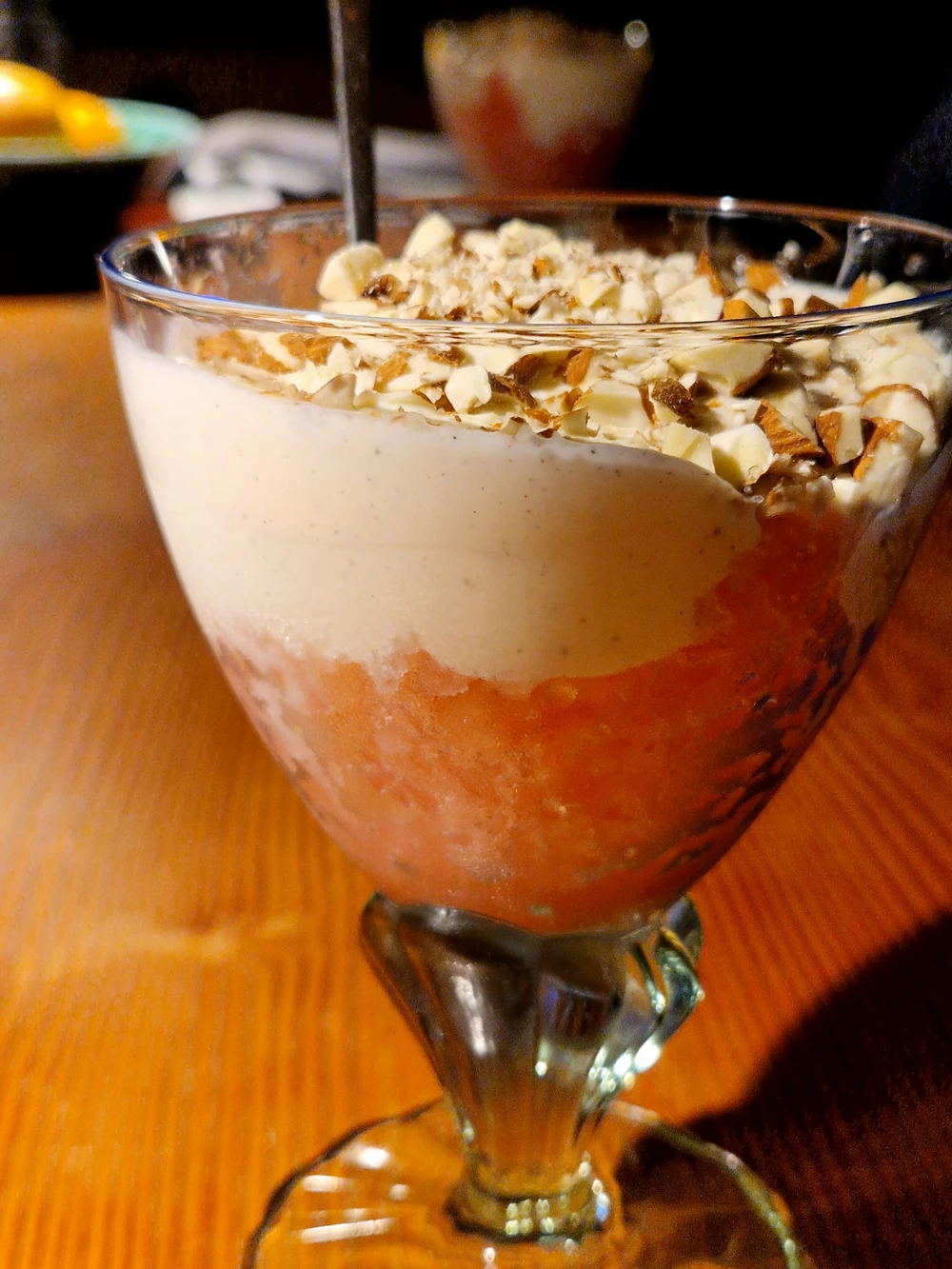 Isen skrabes med en ske og arrangeres i flotte dessertglas. Serveres med lidt cremefraiche rørt med vanilie og et drys hakkede mandler.