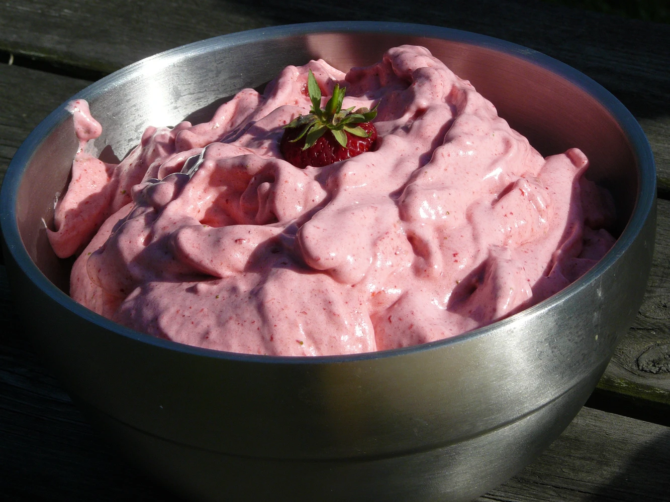 Frosne hindbær, frosne jordbær. evt. frosne ribs eller andre røde bær - blendes i foodprocessor og vendes med flødeskum.