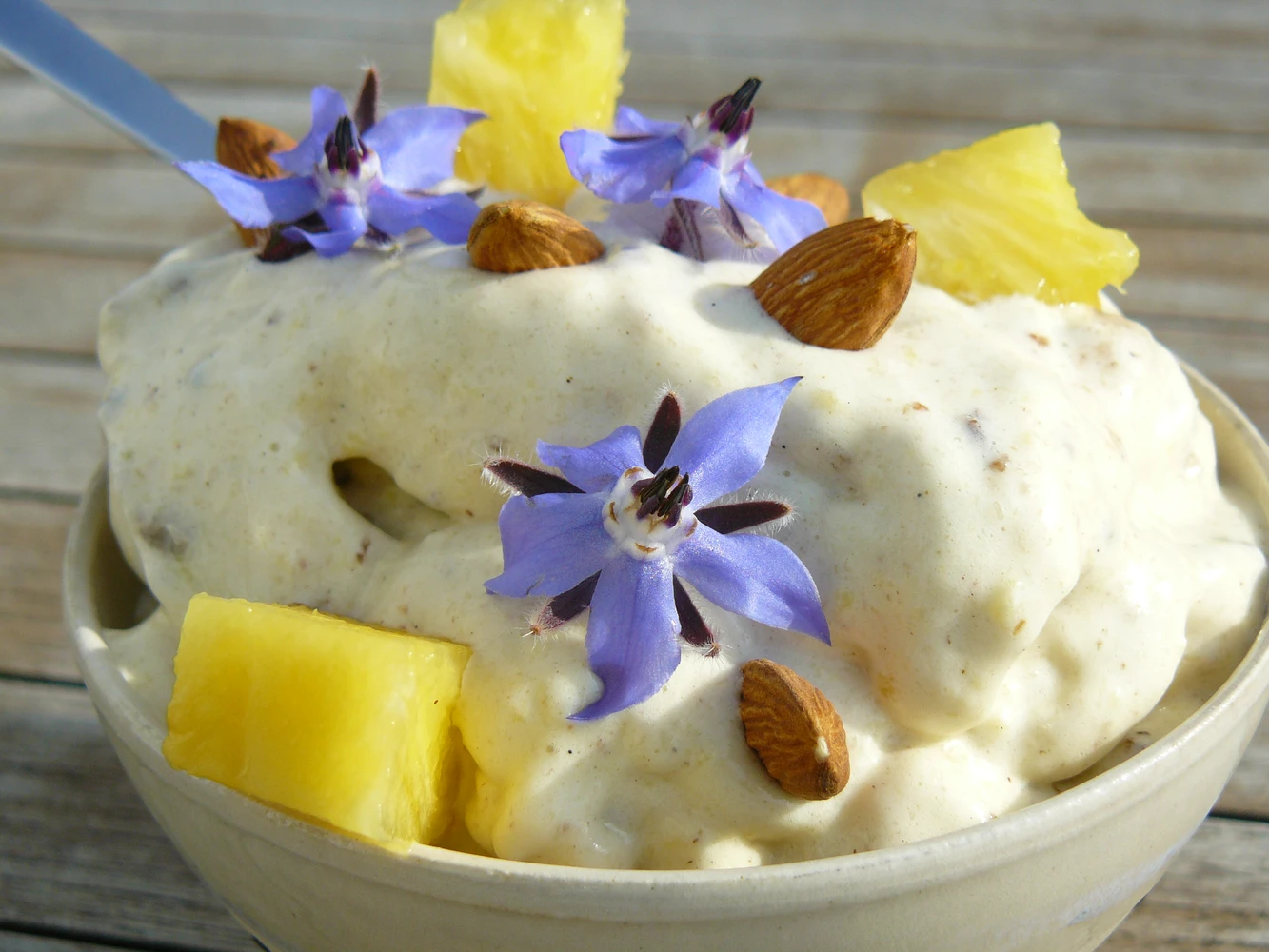 Pyntes med stykker af ananas, mandler og spiselige blomster.